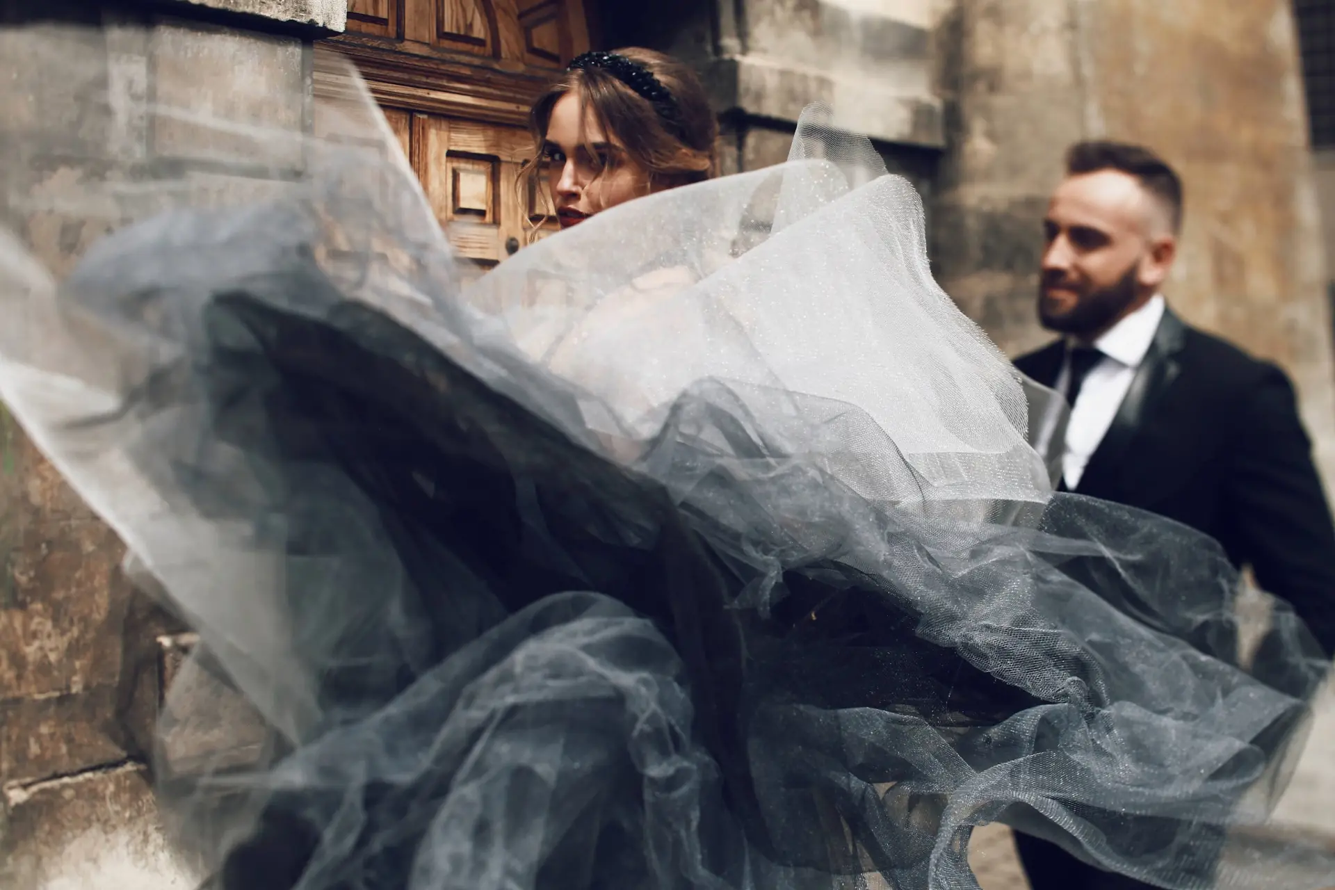 Dazu findest du exklusive Accessoires – von schwarzen Brautcapes über romantische Schleier in Schwarz bis hin zu handgefertigtem Haarschmuck. Alles perfekt abgestimmt, um dein Dark Couture Outfit zu vollenden.