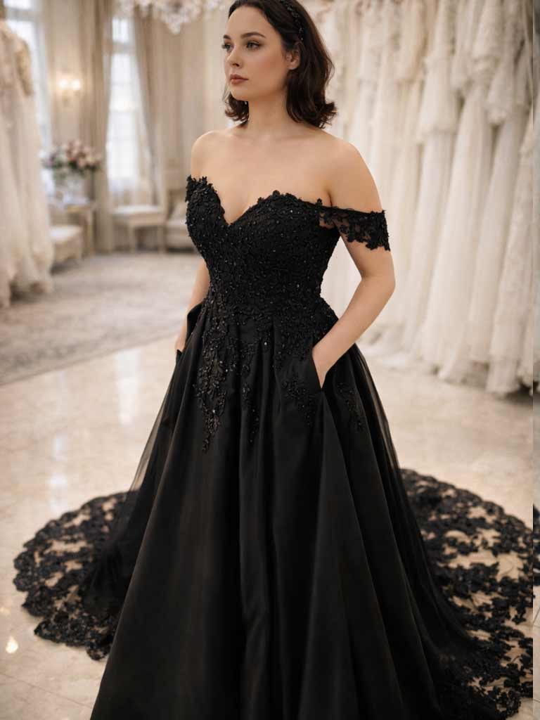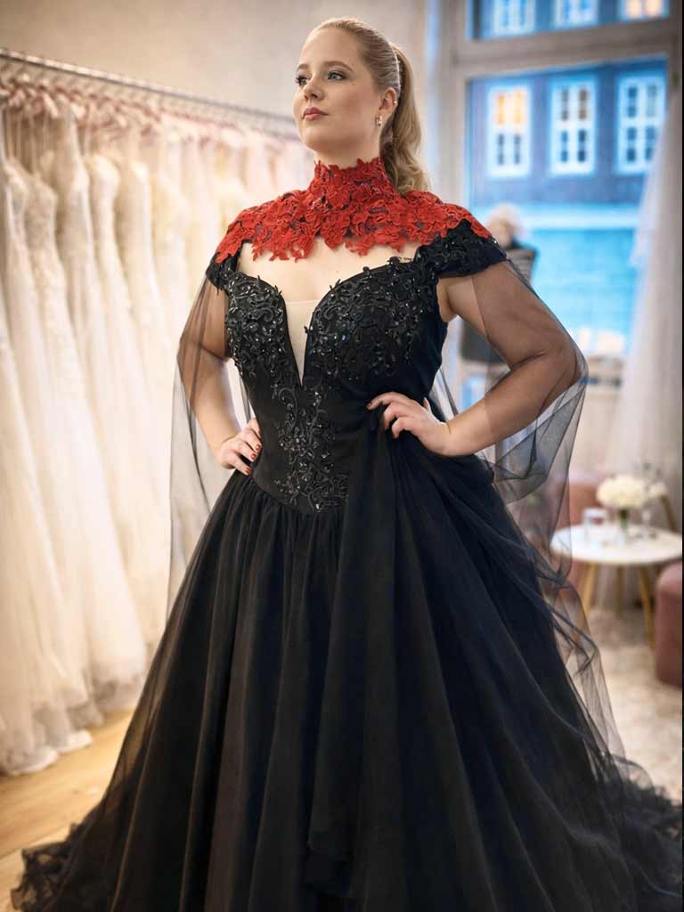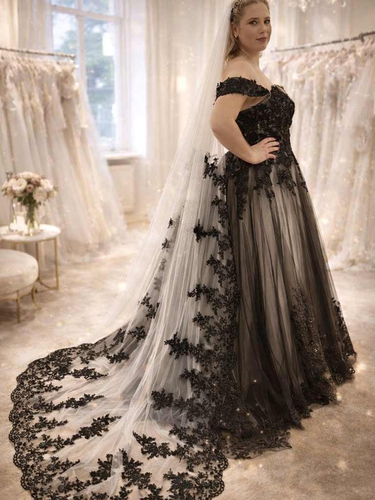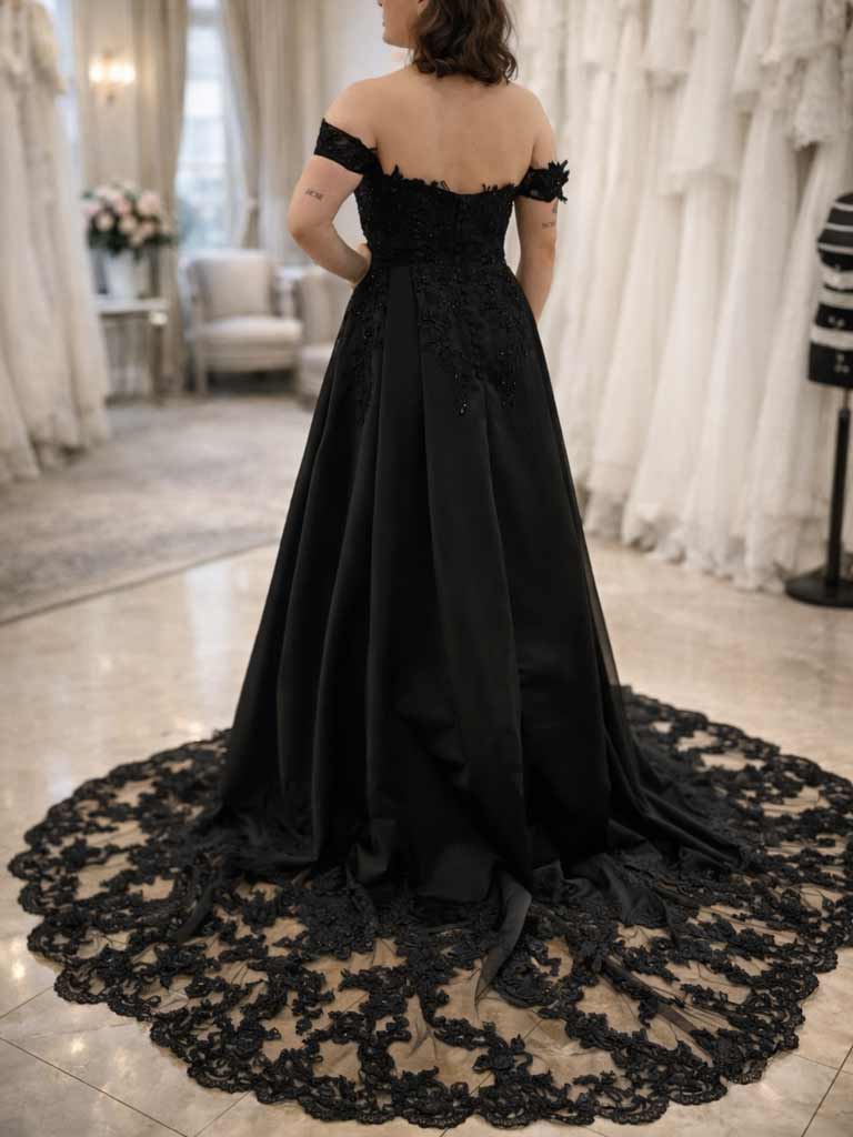 Ein Kleid erschafft diesen Augenblick nicht, doch ein schwarzes Brautkleid kann ihn tragen und bewahren. Es begleitet Bewegungen, Gesten und Begegnungen, ohne sich in den Vordergrund zu stellen.