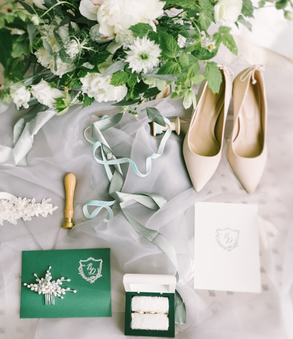 A beautiful bride is holding a wedding bouquet with white roses and peach peonies on a bright window background. Close-up, indoor