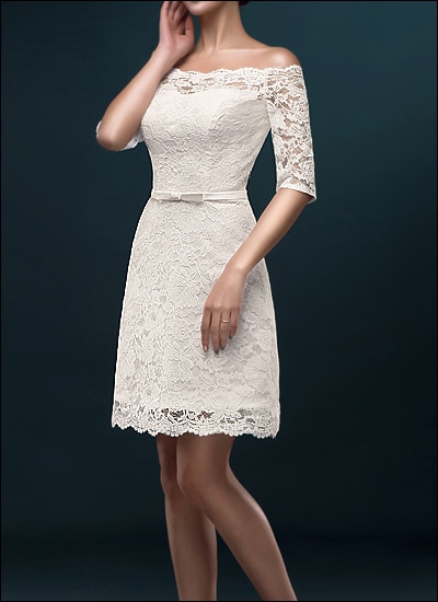Zauberhaftes Brautkleid für deine Standesamtliche Trauung. Es ist komplett aus zarter Spitze gefertigt und Knielang, wodurch es jung und frisch wirkt. Der schulterfreie Carmen Ausschnitt sorgt für eine romantische Dekolleté Ansicht, und die 3/4 Ärmel kaschieren kräftige Oberarme. In der Taille befindet sich ein schmales Satinband, das in einer feinen Schleife endet. Dieses Satinband kannst du auch gerne farblich absetzten. Dieser Look ist zeitlos schön, und auch im feurigen Rot erhältlich. Dazu passt ein Low Bun mit einem farblich abgestimmten Haarband, und dezenter Schmuck. Peep Toes in Creme unterstützen das zeitlose Design. Hauptmaterial: Spitze (100% Polyester)