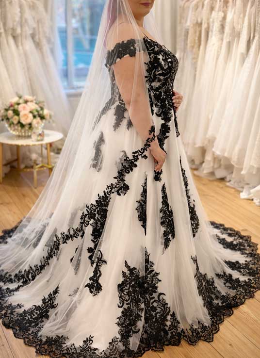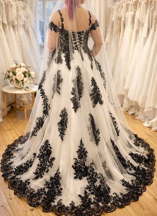 Die Schleppe: Der prachtvolle Saum endet in einer langen Schleppe, die komplett mit einer filigranen schwarzen Spitzenkante besetzt ist – ein absoluter Blickfang beim Gang zum Altar.