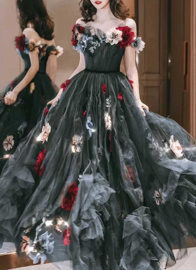 Das schwarze Brautkleid mit Blumen ist perfekt für Bräute, die Individualität, Stil und Emotionen verbinden möchten. Durch den sanft fallenden Rock aus mehreren Lagen Tüll entsteht eine märchenhafte Silhouette, während das florale Oberteil mit feinen Blütenapplikationen einen Hauch von Romantik und Leichtigkeit vermittelt.