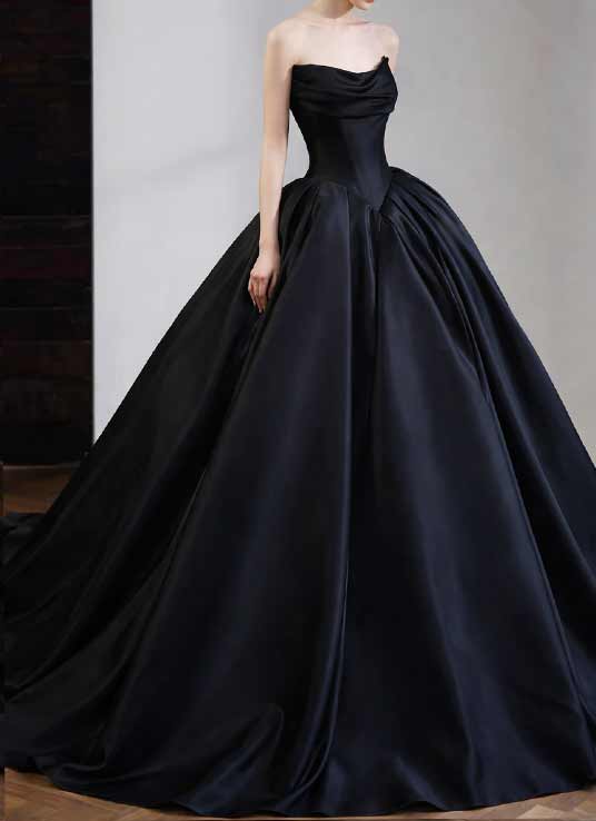 Dieses schwarze Brautkleid aus Satin ist ein dramatisches Couture-Design für Bräute, die Eleganz und Individualität verbinden möchten. Der luxuriöse Satin verleiht dem Kleid eine besondere Tiefe und einen edlen Glanz, während die strukturierte Korsage die Taille formt und eine feminine Silhouette schafft. Das trägerlose Design wirkt modern und zeitlos zugleich und unterstreicht die elegante Linienführung dieses außergewöhnlichen Kleides.