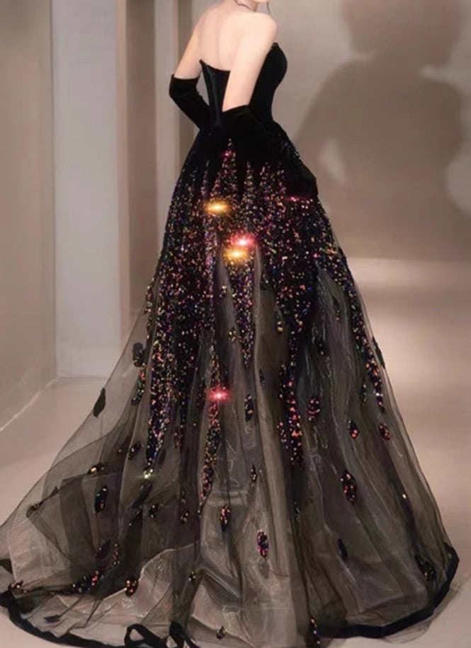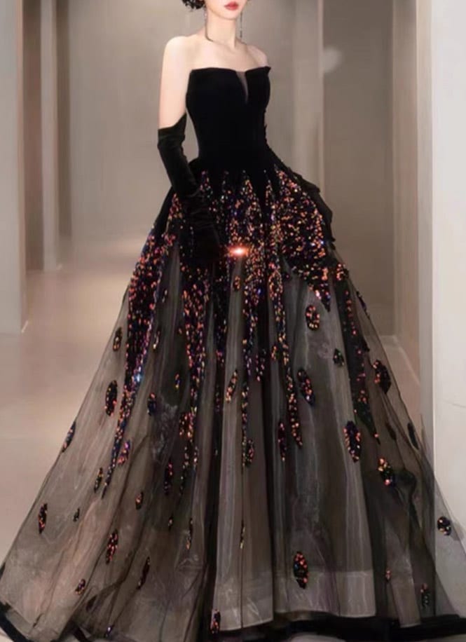 Ein atemberaubendes schwarzes Hochzeitskleid mit Glitzer – gefertigt aus edlem Samt und transparentem Tüll. Die funkelnden Kristall-Applikationen verleihen jedem Auftritt magische Tiefe.