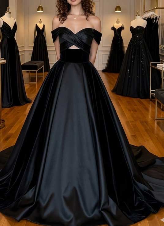 Schwarzes Satin-Brautkleid für den ultimativen modernen Look. Ein puristisches Statement aus tiefschwarzem Satin von LAFANTA. Dieses Modell besticht durch sein außergewöhnliches, gekreuztes Carmen-Dekolleté und eine dramatische Ballkleid-Silhouette – ganz ohne Ablenkung, nur reiner Stil.